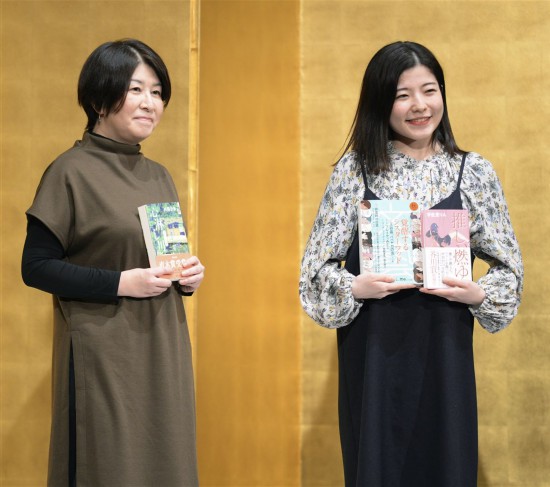 宇佐见铃(右)获得2021年第164届芥川奖,左为164届直木奖得主西條奈加
