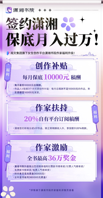 作家扶持方面,潇湘书院作家新福利给予作家每个月额外20%自有平台订阅稿酬。此外,潇湘作家福利还叠加了阅文女频的作家榜单激励——榜单前列单月最高收入30000元,全年最高奖金激励360000元。
