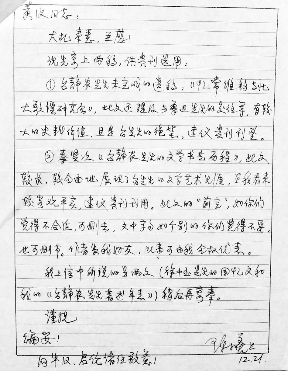 经笔者查阅,《新文学史料》1991年第2期,设有台静农研究专辑,除了刊有《台静农先生事略》、台静农的《酒旗风暖少年狂——忆陈独秀先生》《忆常维钧与北大歌谣研究会》,还有林辰的《台静农书简——致林辰》、启功的《平生风义兼师友——怀龙坡翁》、舒芜的《忆台静农先生》、秦贤次的《台静农先生的文学书艺历程》(从台静农的早年生平一直写到晚年写作生活,未见信中提到的“前言”,当为编者删去)、台益坚的《爝火——追悼先父台静农》和陈子善的《台静农先生后期著作系年》(1947—1990)(其中“第一部分是单篇文章目录,另有未查明出处或未发表的4篇附于篇末;第二部分是单行本书目”)。由此可以推知,陈子善给黄汶的信写作日期是1990年12月21日,台静农的《忆常维钧与北大歌谣研究会》、秦贤次的《台静农先生的文学书艺历程》均是经由陈子善向《新文学史料》推荐发表的。另外,信中提到的“徐中玉先生的回忆文”指的是《琐忆静农师》(作于1987年,为陈子善编《台静农188体育官方ios选》的代序),徐中玉回忆了1936—1937年他在青岛的国立山东大学中文系听台静农讲《诗经》并一起野餐的往事。