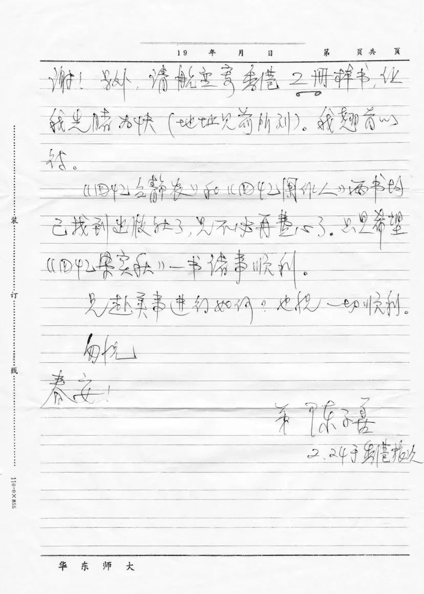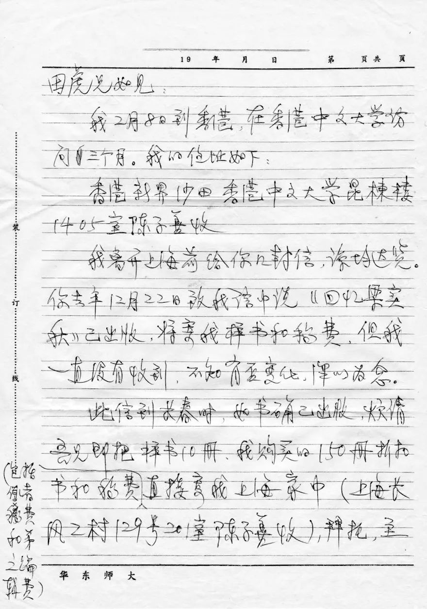 此信到长春时,如书确已出版,烦请吾兄即把样书10册、我购买的150册折扣书和稿费(包括作者稿费和弟之编辑费)直接寄我上海家中(上海长风二村129号201室陈子善收),拜托,至谢!另外,请航空寄香港2册样书,让我先睹为快(地址见前所列)。我翘首以待。