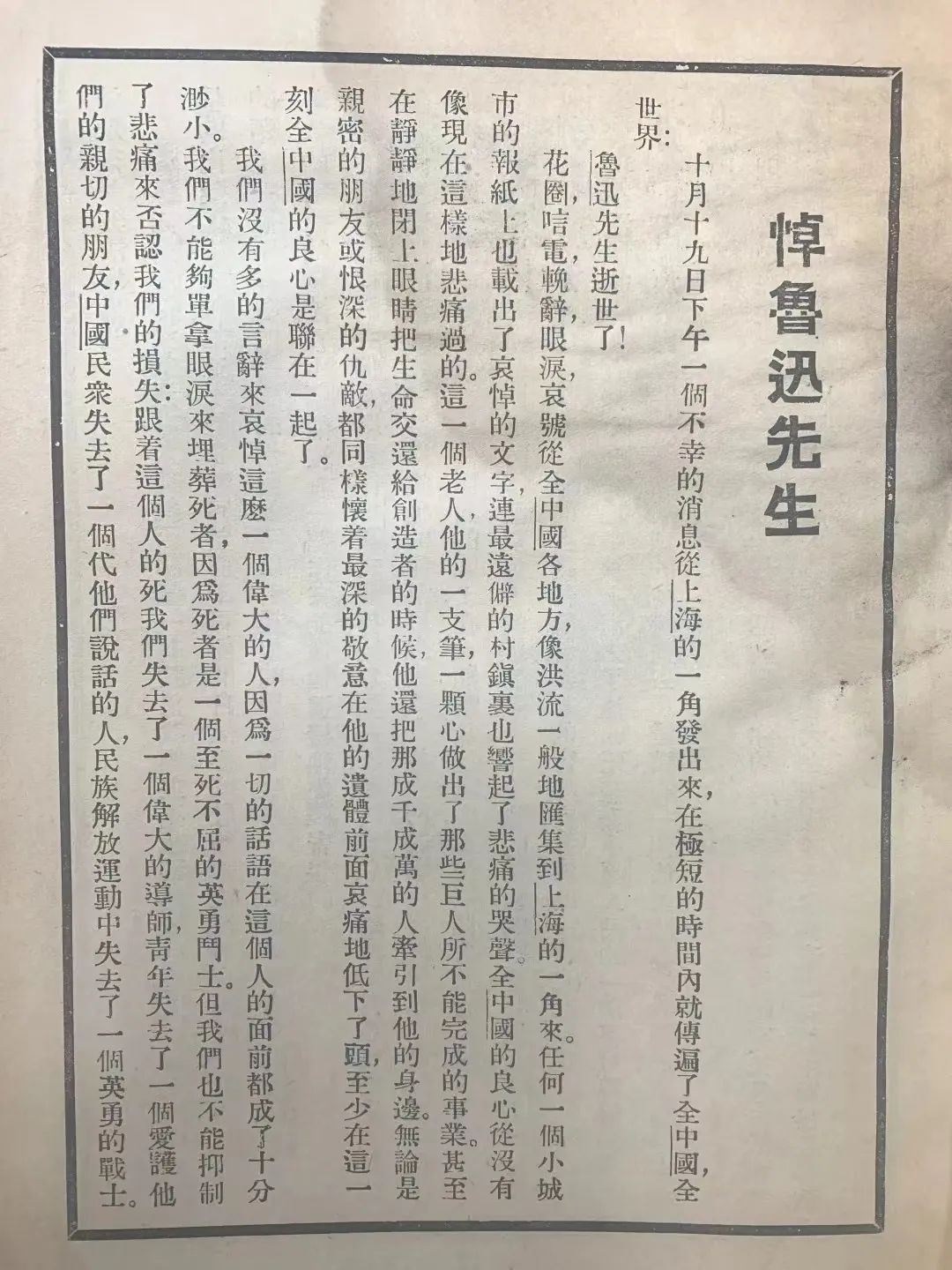 我们没有多的言辞来哀悼这么一位伟大的人,因为一切的语言在这个老人的面前都变成了十分渺小;我们不能单单用眼泪来埋葬死者,因为死者是一个至死不屈的英勇战士。但是我们也无法制止悲痛来否认我们的巨大损失;这个老人的逝世使我们失去了一位伟大的导师,青年失去了一个爱护他们的知己朋友,中国人民失去了一个代他们说话的人,中华民族解放运动失去了一个英勇的战士。这个缺额是无法填补的。(巴金:《悼鲁迅先生》)