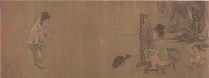 北宋王居正绘《纺车图》表现农家劳作纺纱的情形。图绘一位老妪弓腰驼背,站立纺线,通过两条线与之连接的是画面另一侧的纺车,车右侧有一女子一边要纺车一边怀抱婴孩哺乳,其身后有一幼儿在戏蟾,还有一只黑狗在回首狂吠