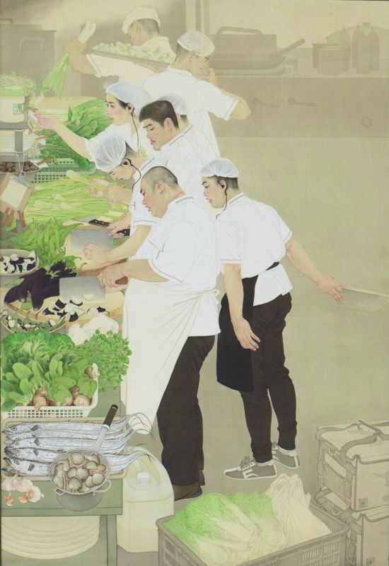 陈治、武欣《零点》《儿女情长》《尖峰食刻》,王珂《都是热血儿郎》,李玉旺《使命》,孙震生《雪域欢歌》等,这些在近几届全国美展中涌现出来的深受好评的中国画之所以能够打动人,还在于作品所描写的城市生活、所塑造的青年人既充满了青春活力,更表现了经济社会中青年一代应有的社会担当。《零点》在日本巡展时被高度关注,这件作品所绘写的中国城市青年生活是如此现代、时尚,而又如此深情和温馨,刷新了国外民众对中国现代生活的认知。画面对工笔人物形象塑造的语言探索,也因承载有温度的中国现实生活而增强了艺术感染力。事实上,新时代中国画最惹人注目的领域已从水墨写意画转向重彩工笔画。当代形态的重彩工笔画对再现深度的发掘取得了前所未有的成就,它不仅汲取了中国古代壁画养分,而且借鉴了欧洲早期文艺复兴坦培拉画法和简约立体的造型语言。而这种语言的探索正是中国快速发展、提升民众现代生活品质的一种审美折射,是新兴的现代城市视觉文化在工笔画领域的审美新创造。工笔画甚至比写意画更具备后现代艺术的观念性,具象描绘却充满了象征和隐喻,这使得工笔画从艺术语言到表现观念进行了多层面、多维度的转换与拓展,从而赋予当代中国画以多种文化艺术的兼容性。