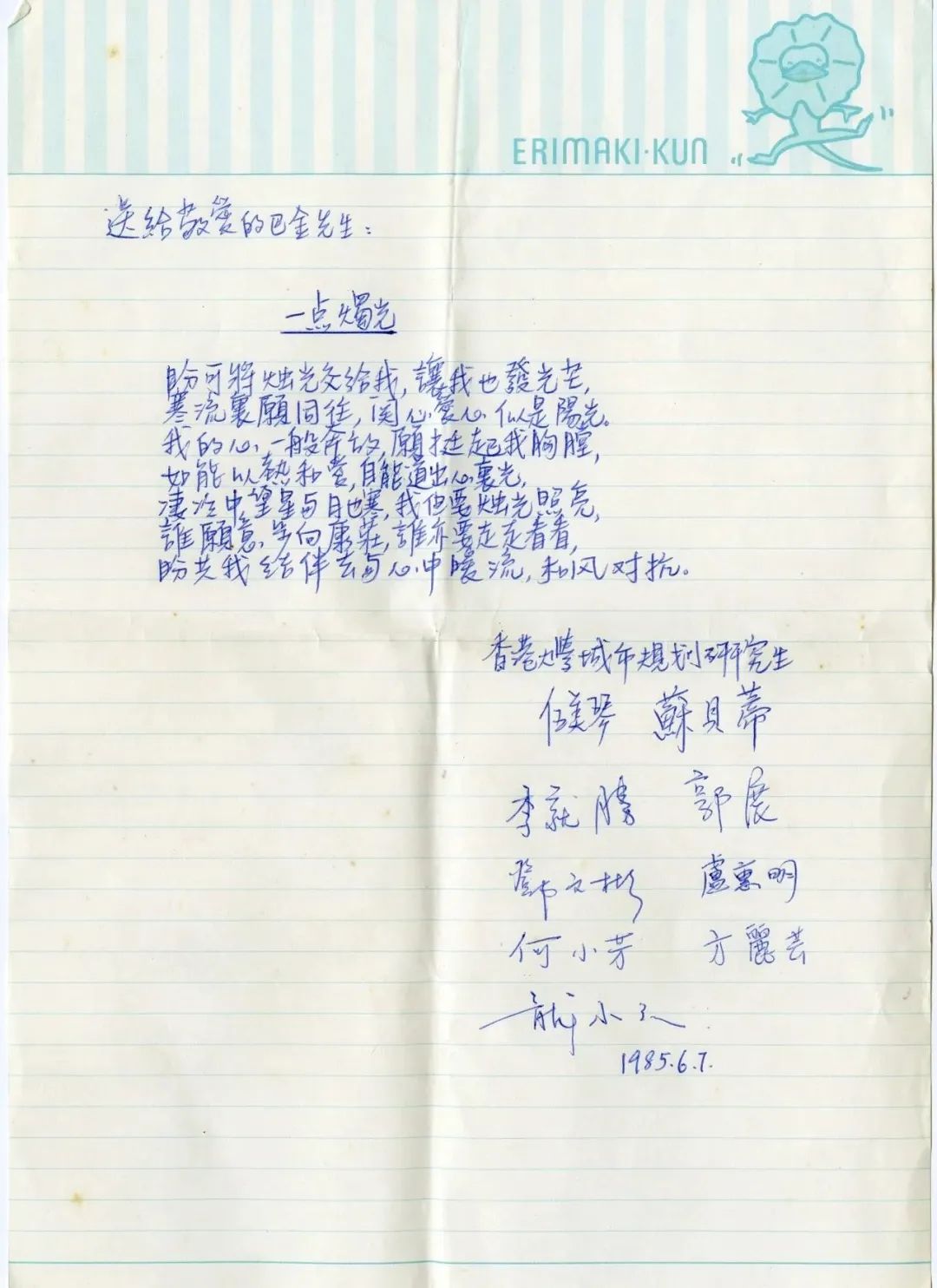在巴老面前唱歌的是香港大学城市规划研究生代表团的十位学生,抄录歌词的信笺下方有他们各自的签名,第一个签名的伍美琴,在一个多月后写过一篇《一次幸福的会见——巴金先生访问记》刊登在当年7月31日和8月1日的《大公报》上,其中写道:“由于我们用广东话唱,为了使他听得懂,便预先抄好了。在他面前,我们十个人轻轻地唱,当唱到‘盼可将烛光交给我,让我也发光芒……以心中暖流,和风对抗。’时,我心底深处,也就发出了强烈的祈盼,希望巴金先生好好地保重身体,把火炬交给新一代的中国青年!”