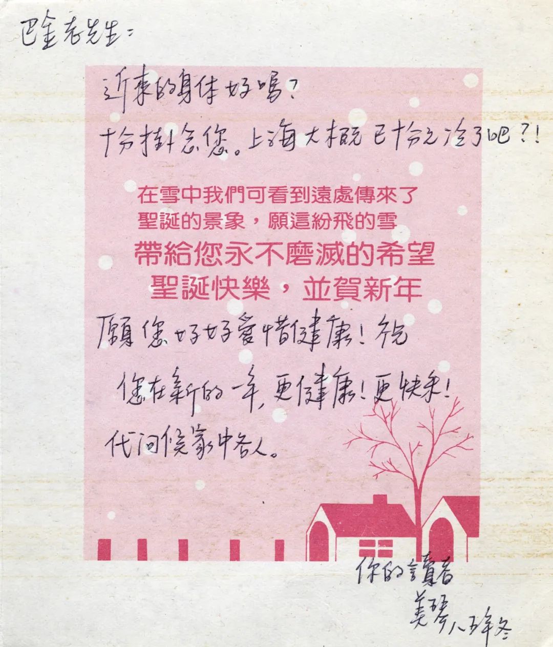巴老在他的全集“代跋”中曾哀伤地说:“三十年代、四十年代的青年把我当作他们的朋友……五十年代到八十年代的青年不再理解我了……因为我老了,我的书也老了……”事实显然并非如此,伍美琴的信、贺卡、文章还有急于拜访巴老的心情就是另外例子中的一个。