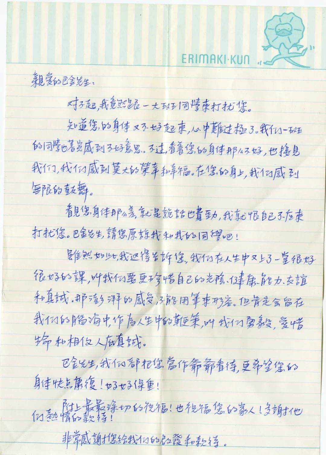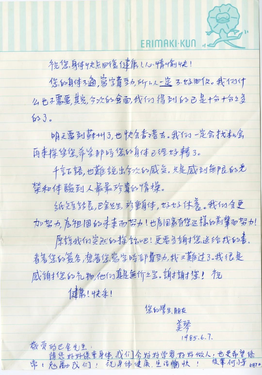 第二天,当他们要离开上海之际,伍美琴给巴老写了两页的长信,倾诉见过巴老后的激动,她特别谈道:“我还得告诉您,我们在人生中又上了一堂很好很好的课,叫我们要更珍惜自己的光阴、健康、能力、友谊和真诚。那澎湃的感受,不能用笔来形容。但肯定会留在我们的脑海中,作为人生中的鞭策,叫我们勇敢、爱惜生命和相信人的真诚。”并再一次说:“巴金先生,我们都很把您当作爷爷看待……”同时表达了这样的决心:“纸短话长,巴金先生,珍重身体,好好休养。我们会更加努力,为祖国的未来而努力!也为国家有您这样的前辈而努力!”署名是“您的学生、朋友美琴”。是的,青年是学生,读者也是朋友。默默中,把温暖和力量传递给新一代青年人。