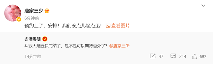 面对潘粤明的许愿:“斗罗大陆五快完结了,是不是可以期待番外了?”,唐家三少回应称:“预约上了,安排!我们晚点儿起点见!”