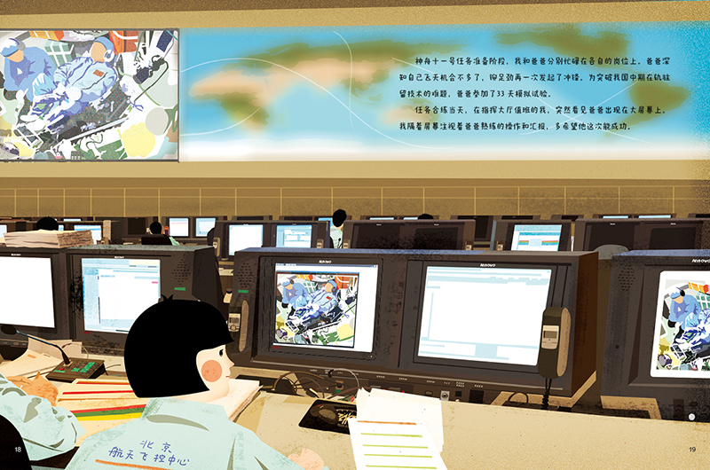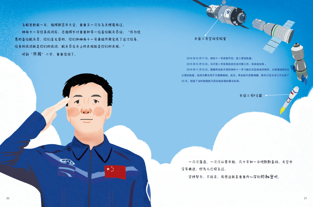 赵墨染:2016年我在清华美院读书的时候选择做科普绘本的研究,有了一些科普绘本的创作经验。2018年中国少年儿童新闻出版总社的唐威丽老师联系到我说有这样一个航天员的故事,问我感不感兴趣。本身我对航天题材也很感兴趣,看了邓清明父女《朗读者》的节目后,被深深地打动了。之后在出版社的安排下我和邓清明的女儿满琪见面了,自此开始了我们三年的创作之旅。这三年我们线上线下沟通了多次,她给我提供了非常详尽的资料。比如故事的脚本,相关的影像资料,参考书籍、电影和纪录片等等。从文字到分镜图再到正稿,满琪很认真地校对每一处。因为她作为航天人的专业背景,有她在我会很踏实。说到印象最深的瞬间是神舟十一号任务准备阶段,满琪在指挥大厅值班看到爸爸出现在大屏上,她眼含泪水的样子让我难忘。