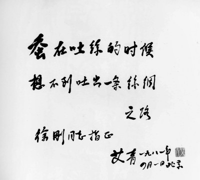 当其时也,艾青进入了一个新的创作高峰期,每有新作,我和杨兆祥,还有周明,总是先睹为快者。长诗如《光的赞歌》等,给《人民文学》,他们有版面;短诗则归《人民日报》的《大地》副刊。除了索稿,更多的时候是聊天。我们在艾青家或是附近的馆子吃饭,艾青牙齿不好,他爱吃“炖得烂烂的肉”。其间,艾青又搬往北纬饭店暂住,离我寄居的华仁路31号只一箭之遥。那时,《光明日报》《诗刊》的社址均在附近,艾青的住处便成了一众诗人的聚集地,那是诗的聚集、语言的聚集、激情的聚集。这样的聚集又是如此纯净:只是为了看望艾青,只是因为对诗的热爱。那热烈的话语声,是“纯金的三轮马车,在生活的旷野上驰骋”的声音。