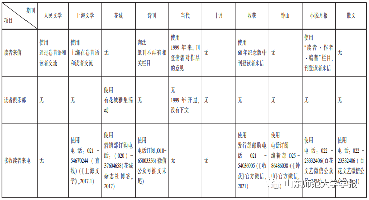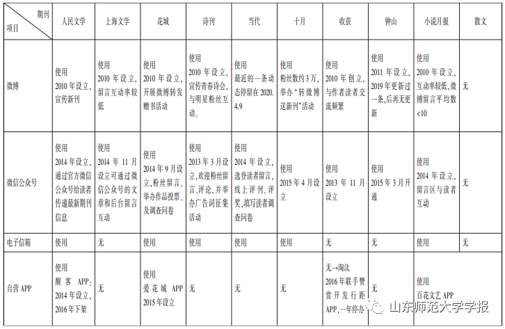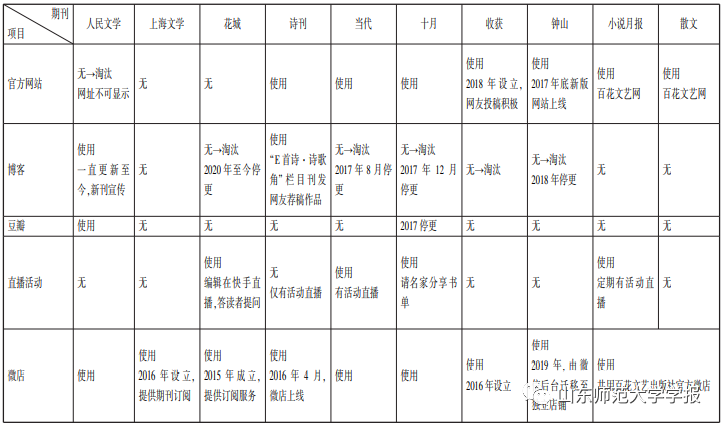 二是传统沟通渠道被逐步淘汰。在纸媒鼎盛时期,一些与读者交流沟通的方式,如召开“读者座谈会”等,现在基本上被放弃。即便一些线上渠道,也会因为新型网络媒体的出现而被放弃。如对博客的使用,2015年之前的高峰期,十大代表性文学期刊中有7家开设了博客,包括《人民文学》《钟山》《收获》《十月》《花城》《诗刊》《当代》。目前仅有《人民文学》《诗刊》还在勉强续更。