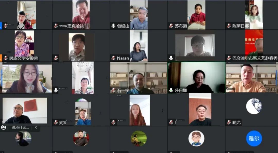 《民族文学》副主编陈亚军、一编室主任杨玉梅、一编室副主任永花、二编室副主任安殿荣、二编室编辑郭金达、一编室编辑柒乐根,《草原》副主编赵筱彬,《鹿鸣》主编苏煜,《骏马》主编晋铭,《鄂尔多斯》执行主编刘军,作者代表西·宝音陶格套,译者代表红英,从专栏作品的思想内容、艺术特点及存在的问题,如何提升作品质量等多角度多层面分别作重点交流发言。大家一致表示,要始终坚持以习近平新时代中国特色社会主义思想为指导,把学习好宣传好贯彻好党的二十大精神贯穿于编辑、创作、翻译中,凝心聚力,携手推进“亮丽内蒙古”翻译作品专栏工作,关注现实,扎根人民,创作翻译出更多体现新时代新发展新气象的优秀文学作品,奋力推进文化自信自强,为铸牢中华民族共同体意识,构筑各民族共有精神家园做出新的贡献。