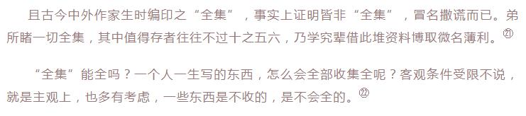 至于编纂全集的效果,对于作者来说,可能增光,也可能受损㉖。我在谈论如何编全集时,曾提及:“编者之所以不遗余力,非要穷尽所有资料不可,有时是不忍埋没天才,有时是基于学术判断,有时则只是为了显示自家迥异常人的见识或韧性,当然,也不乏借此牟利的。”㉗因此,钱锺书谑称编全集“乃学究辈借此堆资料博取微名薄利”㉘,虽稍嫌刻薄,也不能说毫无道理。