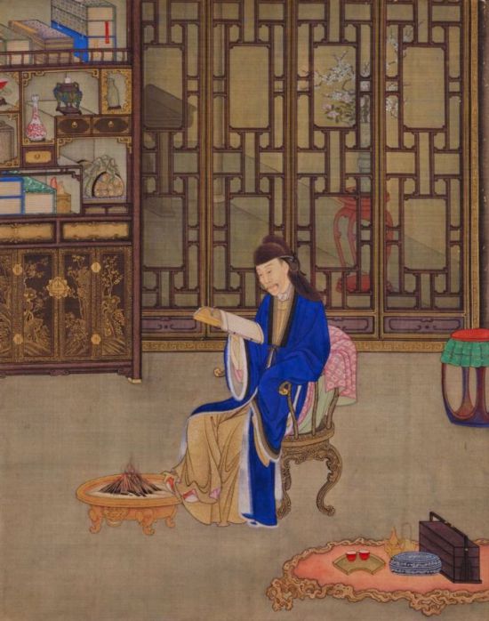 本幅为十六开册页之一。画面描绘胤禛(雍亲王)身着汉族文人服饰,手捧书册专心阅读,足下是热气腾腾的火炉。画中引人注目的是左侧的多宝柜,内置文人雅士喜好的古代彝器、珍本书籍和字画手卷,于此可见主人公高雅之情趣;画面右侧的茶具、食盒则暗示了胤禛此时安适松闲的状态。槅门外迎寒绽放的梅花不显示了主人不凡的品位,亦反衬出小暖阁内的温暖舒适。