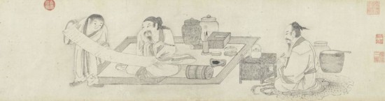 王问(1497-1576年)字子裕,江苏无锡人。明代中期文人画家。此卷画于嘉靖三十七年(1558年),纯以线条作画,左面主人于竹罏前,聚精会神地挟炭烹茶,罏上置提梁茶壶;对面文士展卷挥毫,状至愉悦。席上备有笔、砚、香炉、书卷等。整体呈现文人相聚,论书品茗,弥漫书香、茶香的清雅悠闲生活,这是晚明茶画上常见的题材之一。