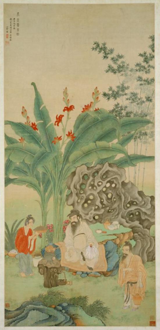 图中描绘出唐代名士卢仝煮茶的情景,是丁云鹏晚年创作的工笔精细画作。卢仝(约796—835年),济源人,祖籍范阳(今河北涿州),早年隐居少室山,自号玉川子,后移居洛阳。诗文俱佳,曾作《月蚀诗》以刺时政,得到韩愈的称赞。性好饮茶,所作《茶歌》中句多奇警。画面上的卢仝身着便服,头戴襆巾,手持羽扇,单腿盘坐于芭蕉前的青石上,背后怪石嶙峋,修竹碧绿,两名仆人在旁侍候。卢仝目不转睛地注视着火上的茶炉,全神贯注的神情被刻划得细致入微。画面花、竹、芭蕉笔笔刻画工整,怪石的阴阳、纹理交代清晰,赋色清淡冷隽,葱翠欲滴,闲和严静的幽雅气氛直扑人面。人物衣纹则用飘洒不群的高古游丝描,或清圆细劲的铁线描,以区别不同质地的衣料,显示出画家别具匠心之处。全图的绘画技巧变化多样而风格基调统一,人物神情生动,树石生机勃勃,笔法如行云流水,超然出众。