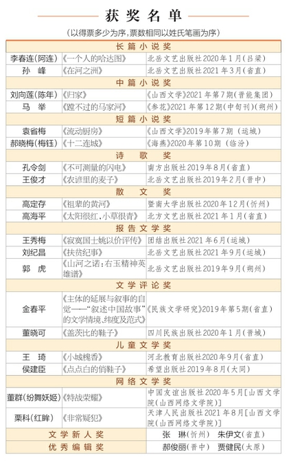 “赵树理文学奖”是山西省最高荣誉的文学奖项,每三年评选一次,今年评选2019—2021年度“赵树理文学奖”。12月13日召开了终评评审会,评选出11类奖项,19部(篇)获奖作品,4位获奖者。其中,长篇小说奖2部、中篇小说奖2篇、短篇小说奖2篇、诗歌奖2部、188体育官方ios奖2部、报告文学奖3部、文学评论奖2部(篇)、儿童文学奖2部、网络文学奖2部。文学新人奖2人,优秀编辑奖2人。
