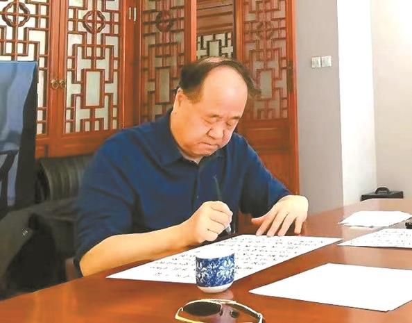 莫言迷恋上书法,是十几年前的事情。2008年夏天,我们一起去参加检察日报社在河南云台山的一次笔会,莫言开始大显身手,凡有人要求留下墨宝,莫言当仁不让,而且来者不拒。那一天晚上,主办方让作家留下墨宝。我们一致推荐莫言,莫言那晚兴致很高,挥毫泼墨。等主人散去,莫言还在写,原来是当地一位司机,求莫言赐字。莫言写完,司机说,莫老师,你的字又大又黑,有精气神,能不能帮我岳父也写一幅?莫言又用左手写了一幅。我一看,这左手比右手写得要好多了,我说,能不能给我写一幅?莫言说,你要字,我回去好好给你写一幅。