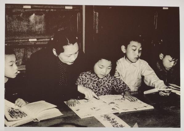 宋庆龄在胶州路第一儿童福利站内指导孩子们读书。