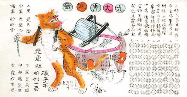 铜钱型消寒图流传在民间,式样也变得更加多样,人们往往会在一连串铜钱边上添上一些图画,写上几句风趣之语,让隆冬的生活变得“有说有笑”。比如河北武强年画《九九消寒图》,画面右侧是八十一个铜钱图样,中部画着一个“老虎拉碾子”的形象,还有一句歇后语“老虎拉碾子——不听那一套”。右上侧则写有唐代杜甫的诗歌《小至》:“天时人事日相催,冬至阳生春又来。刺绣五纹添弱线,吹葭六管动浮灰。岸容待腊将舒柳,山意冲寒欲放梅。云物不殊乡国异,教儿且覆掌中杯。”