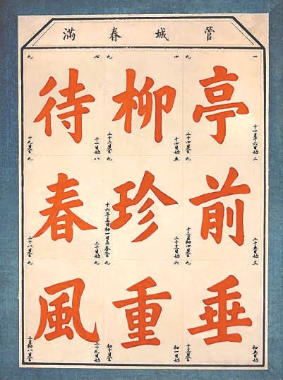 游戏者每日用红色或彩色笔描填一笔,九个字填满正是冬尽春来之时。最流行的九个字是“亭前垂柳珍重待春风”,此外还有“春前庭柏风送香盈室”“故城秋荒屏栏秋枯荣”“雁南飞柳芽香便是春”“待柬春风重染郊亭柳”“庭前春幽挟草巷重茵”“亭前屋后看劲柏峰骨”等等,以上每句的九个字的繁体都合九之数,现代人也创作了简体笔画合乎九的句子,如“幽柏姿美浓荫待春荣”。各句文字虽然不同,表达的都是盼春、迎春之意。
