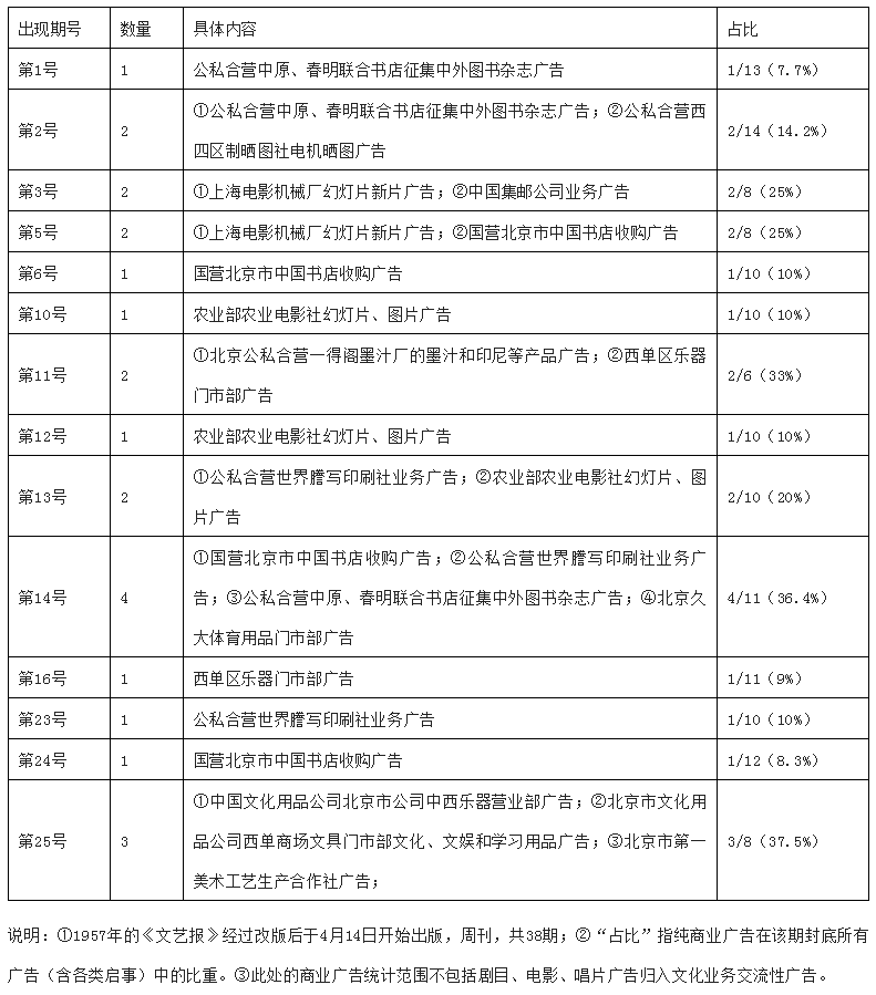 不过,此时期最值得注意的是1957年的《文艺报》,它不仅在封底页连续、大量、密集地刊发各类期刊、图书广告、剧目广告、电影广告、唱片广告以及工业类、体育类期刊广告和一些征求启事,还刊发了数量和频次都很可观的商业广告(见下表)。《文艺报》1957年共出版38期,刊发有纯商业广告的共有14期,占比36.8%,超过三分之一,其中刊发最多的为第14号,同时刊载商业广告4种,刊发比重最多为第25号,占该期所刊广告的37.5%。该刊第2号刊载了《 <文艺报> 广告栏启事》说明其所经营的广告业务范围,第5号和第6号刊发的启事则除了广告业务范围还刊载了具体的广告价目。从刊例中可以看到,《文艺报》接收的广告范围分为书刊广告、电影和戏剧预告、文教用品三类,接收的广告业务分为单色和双色,其中电影和戏剧预告广告价格最便宜,为单色1元/栏/行,双色1.5元/栏/行,文教用品广告最贵,为单色2元/栏/行,双色2.5元/栏/行,书刊广告居中。就《文艺报》具体刊发的广告而言,文教用品广告实际上就是纯商业广告,所以广告费也更高,它们和文学的关系最远,如集邮公司的广告、乐器广告、工艺生产广告等,可见此时广告活动包容性还很强的,业务范围也比较广。 文艺报>