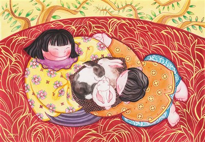 新年画之新,不仅在主题内容之新,也在于创意构思的新颖、艺术表现手法的推陈出新。一些表现传统主题的年画作品,同样让人眼前一亮,呈现出鲜明的时代特征。今年的新作中有不少以生肖兔作为主题,比如《瑞兔呈祥》笔触细腻,采用了装饰艺术简洁的表现形式,营造出空间感;《年年岁岁》在黄、橙、红三色的喜庆基调中,中间添加人物手拿糖葫芦,仿佛是喜庆年节的一次奇妙之旅,让传统抵达今天;《新生》则以迎接兔年为背景,描绘了一对母子在自然的美景中迎接一窝新生小兔的场景,画中人物采取插画的表现手法,人物和兔子都各自以圆形的轮廓进行强化,传递出春节的团圆氛围和暖意融融。丰收一直是年画的重要表现主题之一,丰收主题亦在今年的新作中占有相当的比重。比如具有显著江南水乡风格的《我们的小康生活》,采用工整细致的表现技法,细腻地描绘了江南古镇的民居,以当地人喜爱的舞狮、舞龙、击鼓、玩船等喜闻乐见的形式庆祝丰收,以红色调来表达人们喜悦的心情,红火、热情、喜悦,让观者可感可知。又如表现时令节气主题的作品《春风》,以独特的俯视视角,从天空中飞舞的3只具有中国传统美好寓意的风筝,俯瞰在广场上沐浴春风的老老少少,洋溢着春天的活力与希望。