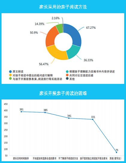 9.家长没时间是阻碍亲子阅读的主要原因。家庭中难以开展亲子阅读的主要原因,首位的是家长没有时间陪伴;其次是不知道如何选择合适的图书。此外,不了解亲子阅读的方法与孩子喜欢独立阅读或不配合家长也是令家长头疼的问题。《报告》显示,家长迫切需要“来自外力”的亲子阅读方面的指导,排在首位的是学校老师指导,其他包括希望图书中能附带亲子阅读方法,通过参加书店或图书馆举办的亲子阅读活动得到指导,媒体加大对亲子阅读宣传力度等。