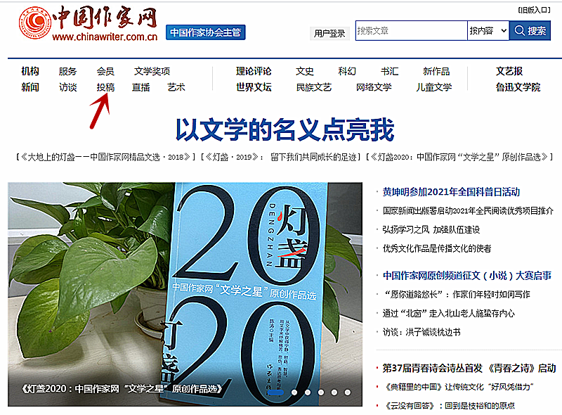 1、首先登录中国作家网//m.bafconsult.com/ 在首页顶端频道分类位置找到“投稿”(标红色箭头处),点击进入原创频道。