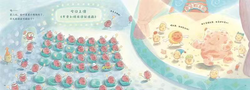 孔阳新照:在故事中,我希望能让红豆变魔术一般地变身,呈现出各种各样美味的食物,但红豆的“变身”让我大费脑筋,因为红豆变成红豆沙的过程比较难表现,如果把握不好角度,可能还让小朋友觉得“碾碎”了的红豆很可怜。直到有天灵光一闪,我想到了把“红豆”和“数字”联系在一起,通过减少红豆的数量,帮助它们完成变身。