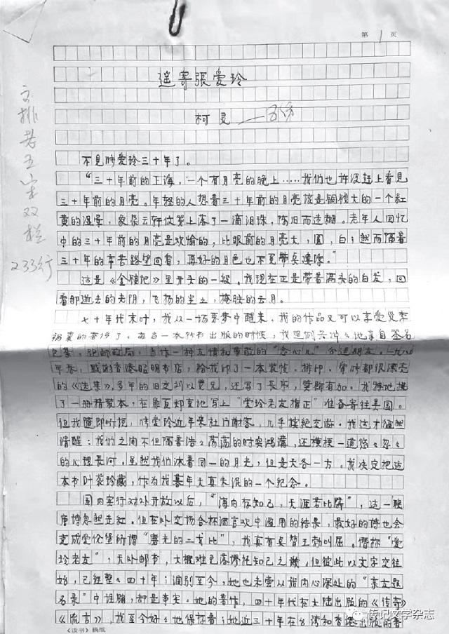 第一,《遥寄张爱玲》是柯灵应《香港文学》主编刘以鬯的邀约才写的;