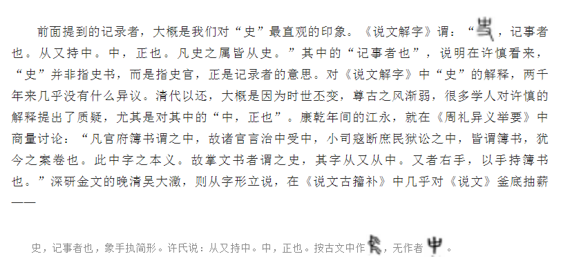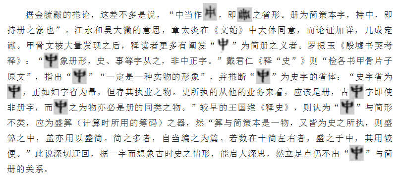 这个崩溃和重建的过程,传统经典系统的圈定范围桶底脱落,精心述作过的有周一代文化不再是唯一选择,原先被经典封存的能量持续涌出,此前不够雅驯的文化就此有了新的意义。对“史”字的解释,便也逐渐离开了此前的“记事者也”范围,向具体事务和神明祭祀两个方向扩展。1960年代,屈万里在审阅一篇文章时表示:“史字上半所从之□(按,‘之’后有一空格,疑有脱字,似应为‘图片’上之‘图片’),绝非简册之形。因册字习见于甲骨文及金文,绝无作图片者(甲骨文往往以‘史’为‘事’)。”1980年代初,胡淀咸的《释史》一文,考察多种甲骨和金文,确立了史与事之间的关系:“‘史’和‘事’,原就是一个字。所谓史官实是任事之官,史、御史、大史、卿史都是由它所执掌的事务而得名的。”从这个方向看,史与事的贯通,正是高层文化跟具体事务的沟通——或许在起始的时候,史官就并非一直高居庙堂,秉持着抽象的中正之德,目光如炬,执简运笔——那些经典系统中致力于精神层面的人,在更深的意义上,一直就没有脱离基础性的劳作与时日。