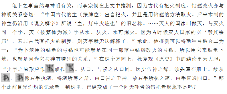 不止庶事,仔细推敲起来,恐怕连神明祭祀之事,也无法离开具体的劳作。劳榦大概就是发现了其间的关联,在《史字的结构及史官的原始职务》中,他便认定史的起源与弓钻有关:“在史字中其所从的图片就是一个弓背向下的弓形,金文及甲骨凡从弓的字,弓都是对侧面的,这都是射箭的弓,只有这个弓形的弓背向下,对于弓钻的形状,正皆符合。”手持弓钻的史,主要是钻燧改火和攻治龟甲。钻燧不消说需要弓钻,攻治龟甲其实也在所难免:“龟甲是比较坚硬的,为求得卜兆先要在预备灼火之处,把它刮薄,因为硬难以刮薄,因此便先钻,然后在钻处再用凿扩大。”如此手上有具体之事的史,当然不会跟抽象的中正无关。王国维《释史》云,“中正,无形之物德,非可手持”。李宗侗《史官制度——附论对传统之尊重》承接此义,分析鞭辟入里:“中正是表示无形的物件;而最初的人所表示的物品多半是有形的。所以不可能以手持无形的物,这是不合于古人的思想的。”