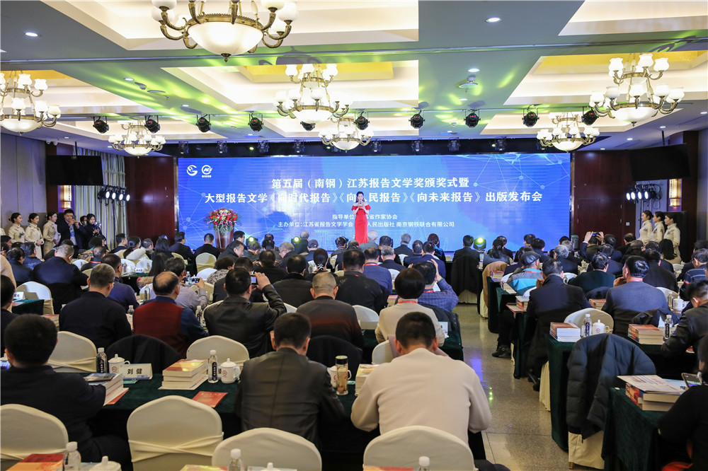 2月16日,文学之都南京春风和煦,第五届(南钢)江苏报告文学奖颁奖式暨大型系列报告文学《向时代报告》《向人民报告》《向未来报告》出版发布会在南钢宾馆隆重举行,10位作家捧回了沉甸甸的报告文学奖奖杯。