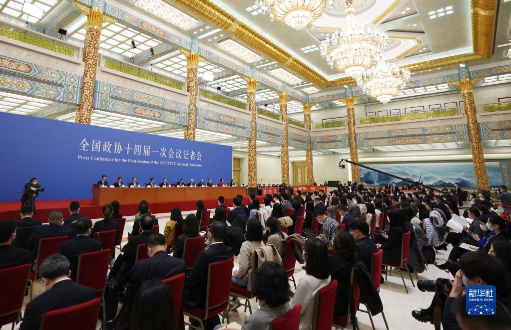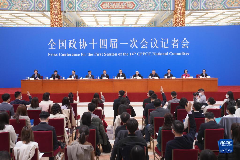 3月5日,全国政协十四届一次会议在北京人民大会堂举行民主党派中央和全国工商联领导人记者会。 新华社记者 曹灿 摄