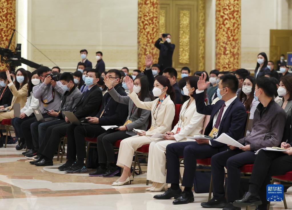 3月5日,全国政协十四届一次会议在北京人民大会堂举行民主党派中央和全国工商联领导人记者会。这是记者在举手提问。 新华社记者 曹灿 摄