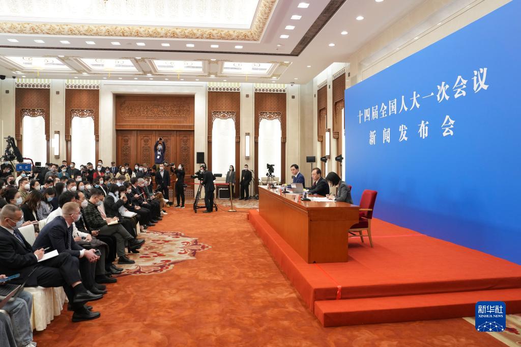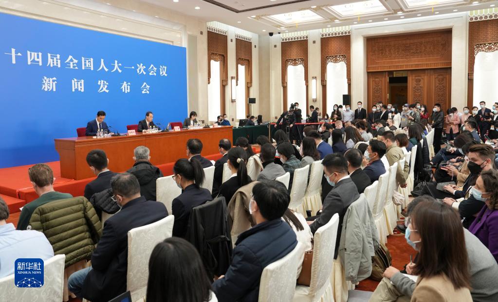 3月4日,十四届全国人大一次会议在北京人民大会堂举行新闻发布会。大会发言人王超就大会议程和人大工作相关问题回答中外记者的提问。 新华社记者 邢广利 摄