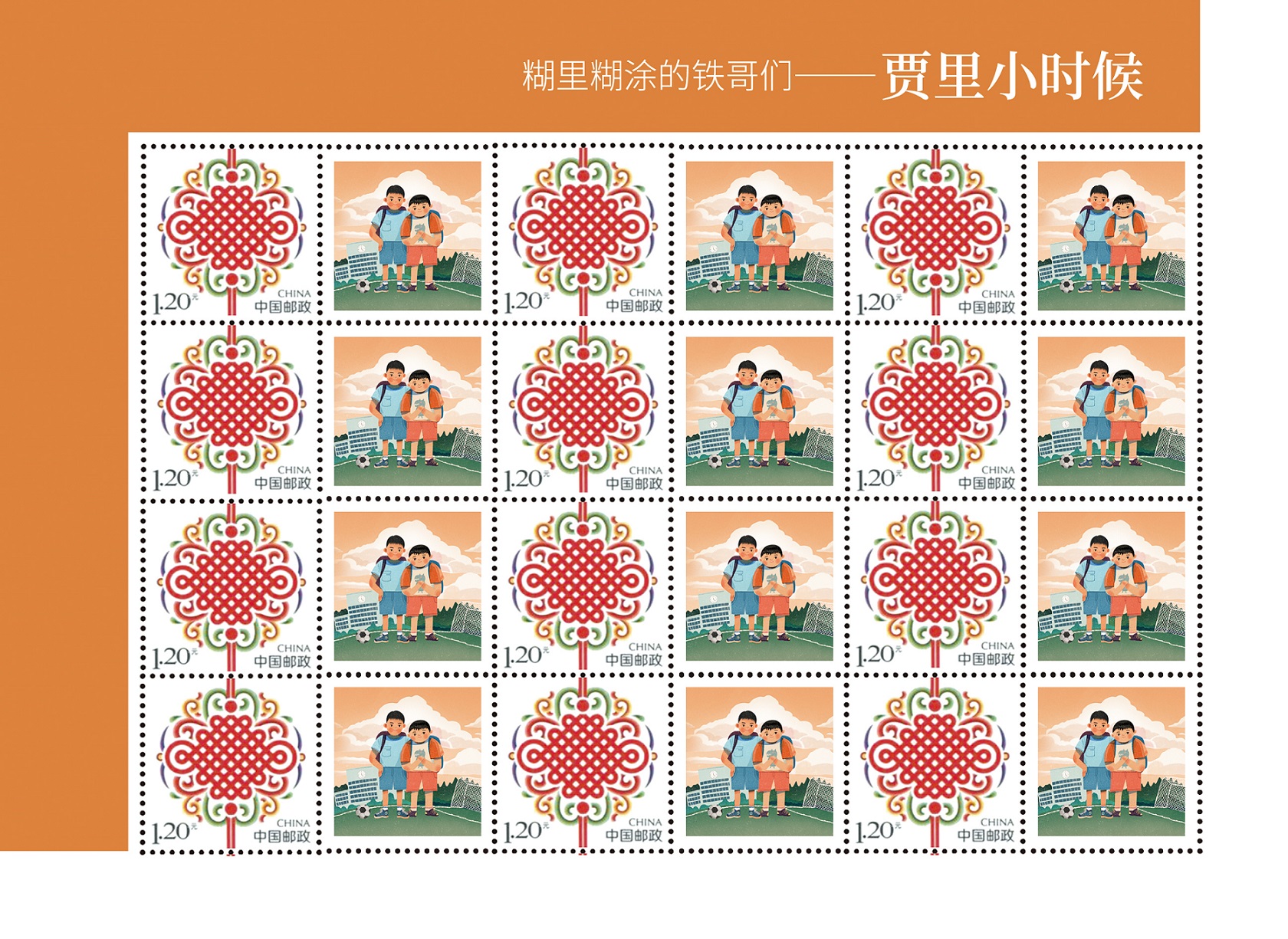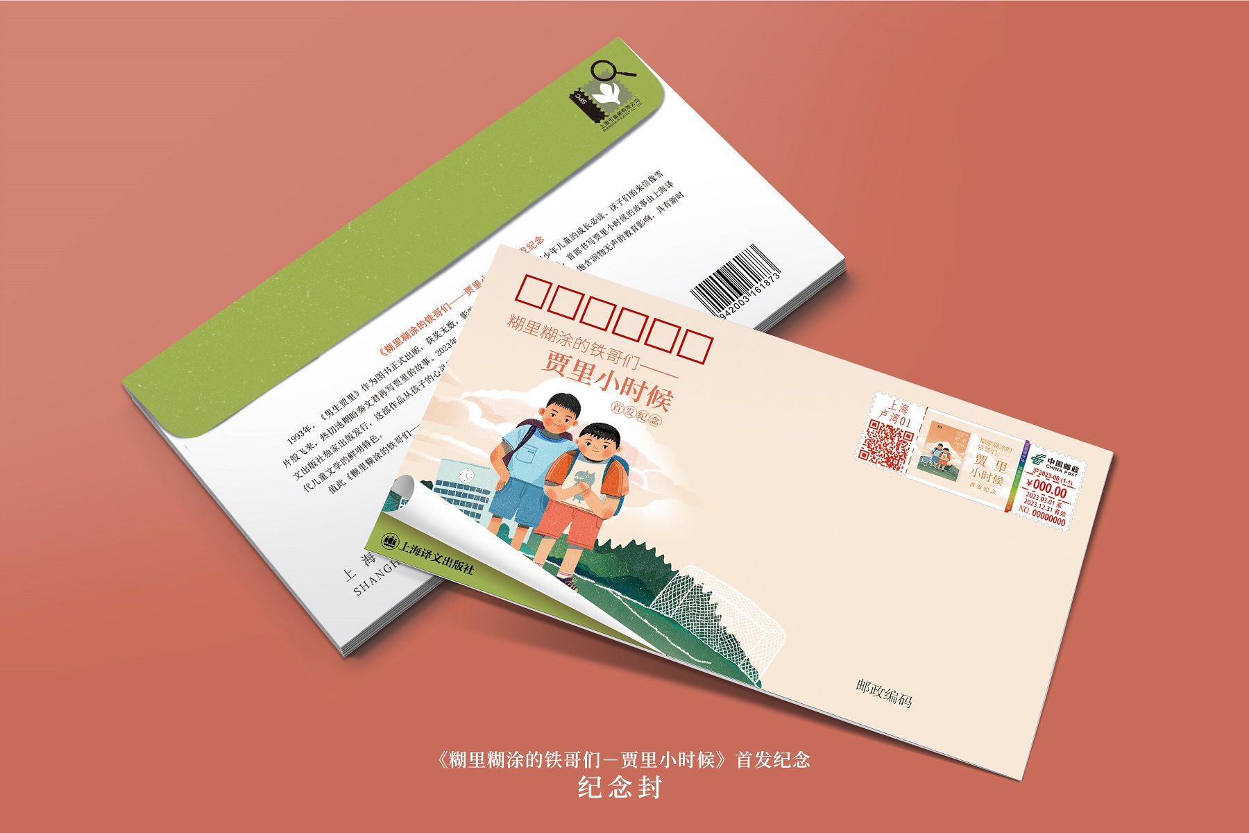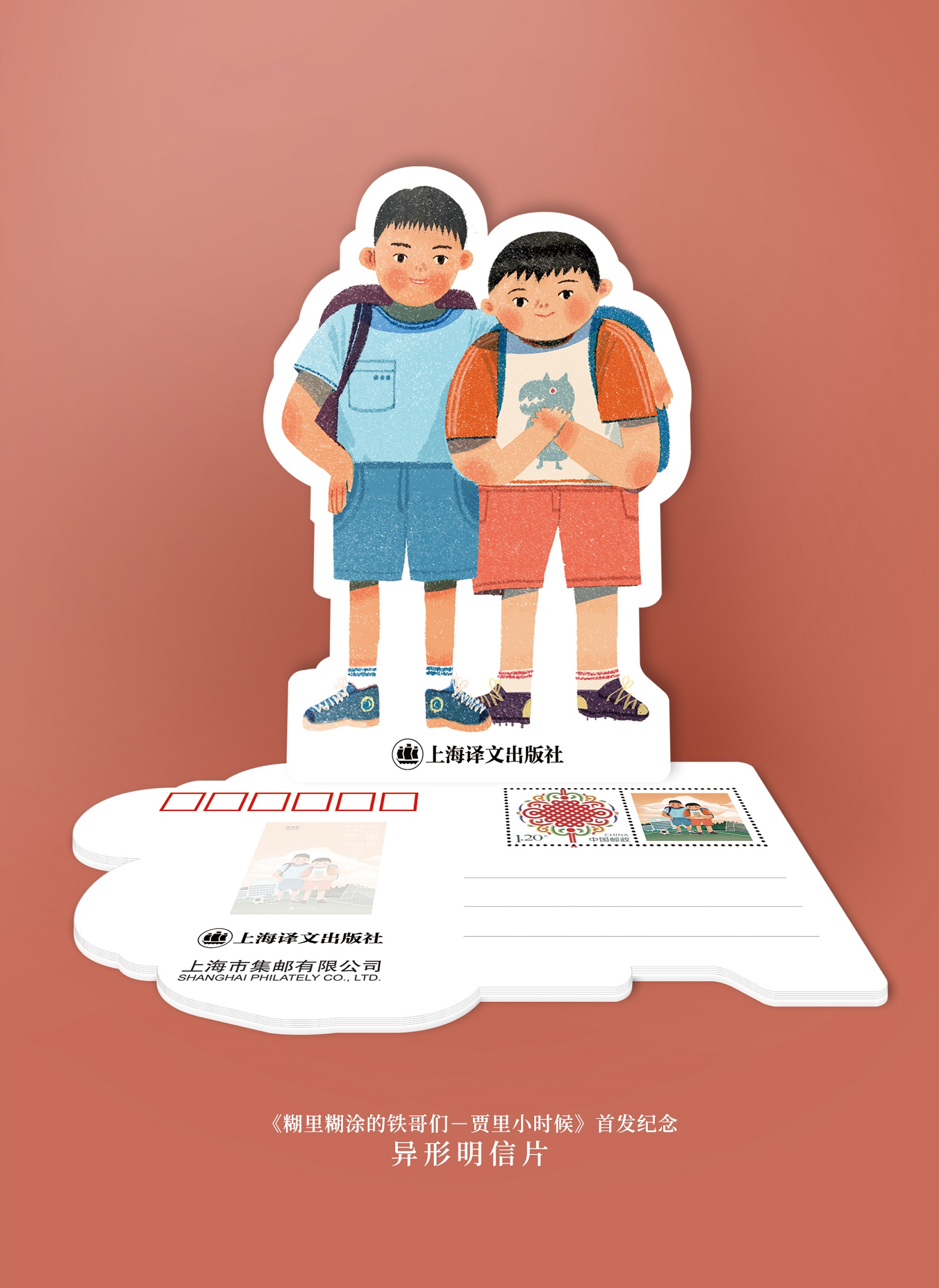 为了鼓励小读者们通过书信的方式把最新的阅读体验反馈给作家,上海译文出版社联合中国邮政共同设计定制了《糊里糊涂的铁哥们——贾里小时候》纪念邮品——邮票、邮戳、异形明信片和纪念邮封。邮品选用由知名自由插画师Lisk Feng特别为新书设计的封面插图为底稿,主要凸显了小学时期就成为铁哥们的贾里和鲁智胜之间的友谊。