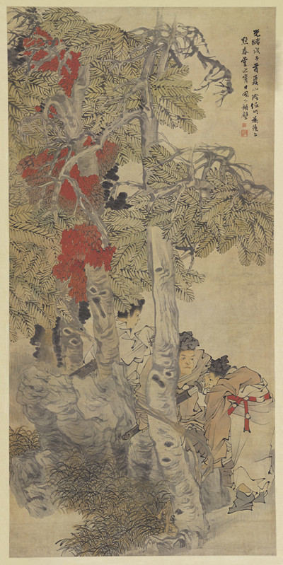 任画多英雄气,画中英雄气,千秋犹凛然,因此如何表现其“英雄气”,是观画的一个关注点或重点。画中扑入眼帘的,首先是那一树红色,是老树上挂的藤蔓,纷披着红花红叶,灿烂照眼。而右下人物的红腰带与之相映,全图生色。