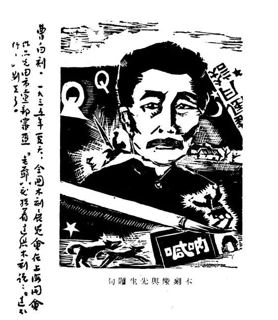 在纪念的同时,这些插图也在塑造鲁迅的形象[6],如彼得•伯克指出的,“人物肖像也是一种符号形态”[7]。1938年版的插图建构的是富有生活气息、有血有肉的“人”的鲁迅,是“生活者”鲁迅,其时“革命斗士”的一面尚不明显。文前41张插图中,剑拔弩张的只有第五卷第二张“木刻像与先生题句”。木刻正中为严肃凝重的鲁迅,四周环绕各种意象:左下角插入一支巨笔,既是作为战斗的武器,构图上又是分割线;笔下垫着如碑文状的《呐喊》,笔尖站立一人两手挥舞,似乎是狂人形象,后面有两条恶犬对之狂吠;左上角两个变形的巨大的Q字,又延伸出闪电刺向阿Q样的人物;右上角则为倒立的“准风月谈”,再下则是月亮星星照耀下的山村。鲁迅在木刻旁边题辞:“曹白刻。一九三五年夏天,全国木刻展览会在上海开会,作品先由市党部审查。‘老爷’就指着这张木刻说:‘这不行。别挂了。’”木刻渲染出鲁迅战斗的场景,鲁迅的题辞又揭示了国民党的压迫,互相呼应。