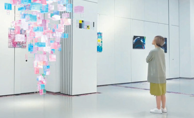 良好的交互体验,也是数字艺术展联结观众的关键纽带。数字艺术不同于玻璃框里的画作、展柜里的文物,它可触、可感、可变,可以充分调动观众的好奇心与参与性。在天津滨海美术馆“被隐藏的艺术——AR数字艺术展”上,观众打开平板电脑扫描展墙上的平面绘画,立体星云、全息影像等便会“一跃而出”,在平板电脑中生成一件与平面绘画有一定关联度的全新数字艺术作品。平面绘画与数字艺术的有机结合,在带来趣味体验的同时,为观众打开作品“隐藏”的另一个空间,使其获得新的美学视角和思考维度。在首届上海数字艺术国际博览会上,还有不少作品应用人机交互技术表达艺术观念,吸引观众参与创作,使观众成为作品的一部分,或者根据艺术大师的风格生成新的平面绘画,为艺术创作带来更多可能。数字艺术的交互性,让高雅的中国画、前卫的抽象画不再曲高和寡,使艺术传播模式从单向信息输出转变为双向沟通交流,丰富了作品的生命力。