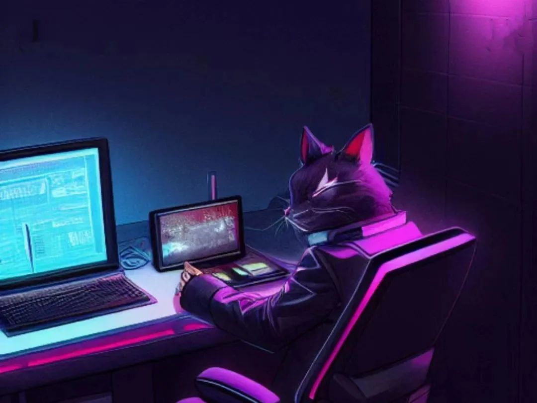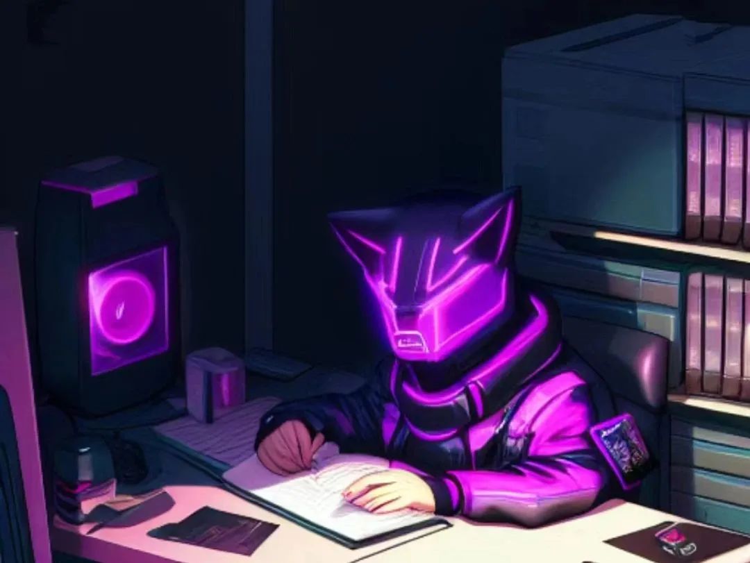 AI图像生成:一只赛博朋克风格的猫在书桌前写小说
