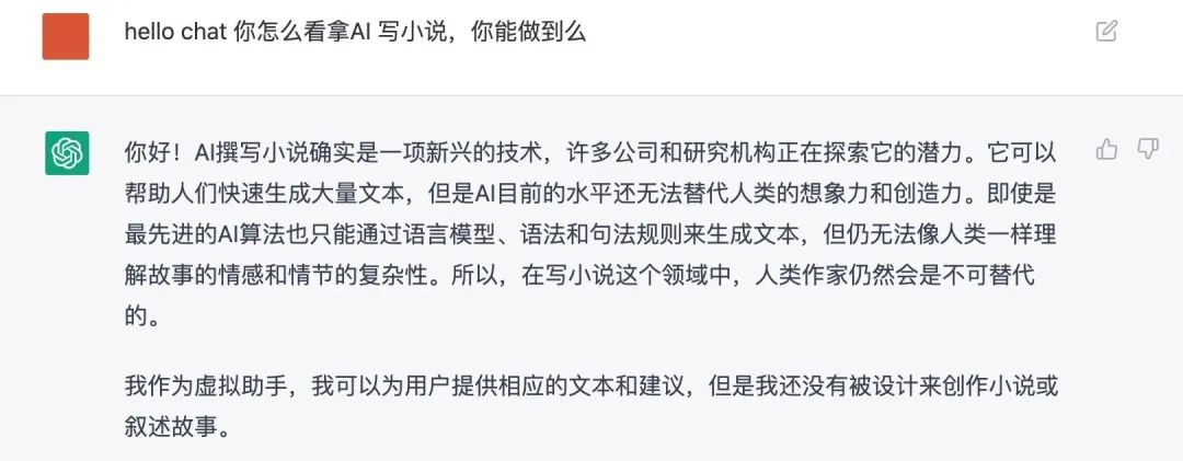 有趣的是,ChatGPT对自己能不能写小说也有着自己的回答。
