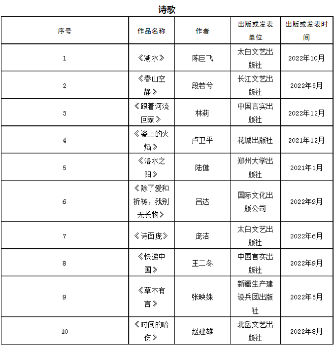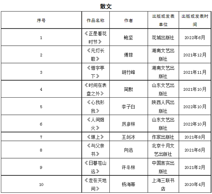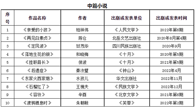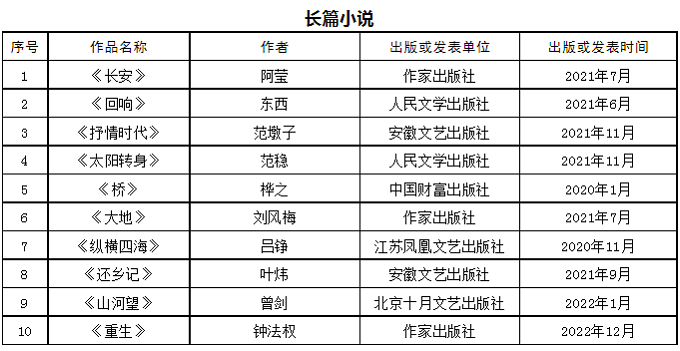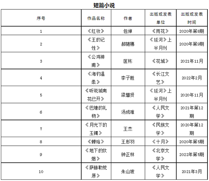首届石峁文学奖初评委员会经过认真阅读讨论,于2023年4月17日投票表决产生50部(篇)初选作品。现将初选作品名单在鲁迅文学院微信公众号和中国作家网(//m.bafconsult.com)公示。公示期截止于2023年4月21日,在此期间,如发现初选作品有不符合《首届“石峁文学奖”参评作品征集启事》的情况,请向评奖办公室提出。