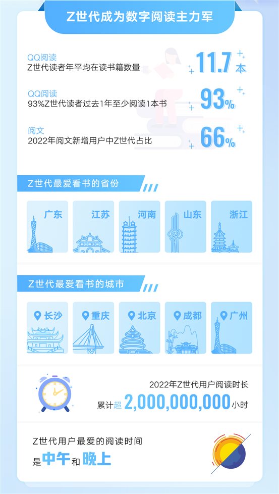 《Z世代数字阅读报告》显示,Z世代的阅读画像为数字阅读“随时随地”的特性,增添了更多可供解读的新意:从时间上看,2022年,Z世代阅读时长累计超过20亿小时,相当于读完2000万本《史记》的时间。Z世代最爱的阅读时间是中午和晚上,中午12点和晚上10点是阅读高峰期;从地域上看,广东、江苏、河南、山东和浙江位列Z世代最爱读书省份TOP5,长沙、重庆、北京、成都、广州则跻身Z世代最爱读书城市。