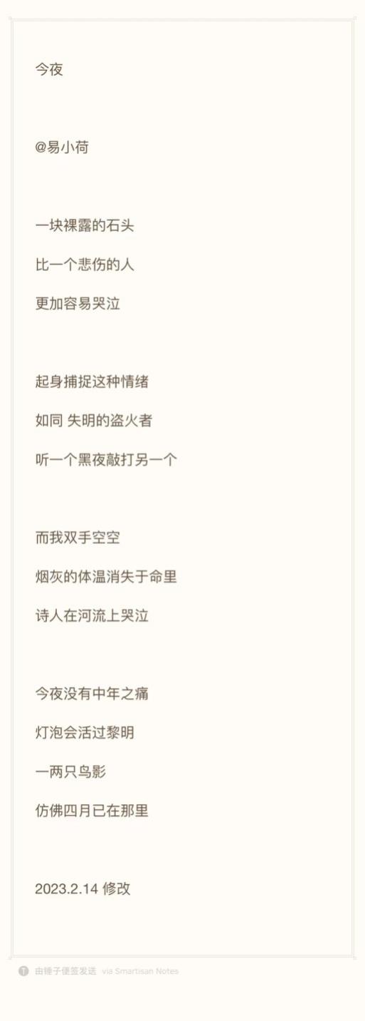 易小荷偶尔喜欢在朋友圈写写诗,她将自己的诗歌称为“抽屉文学”,从未发表过