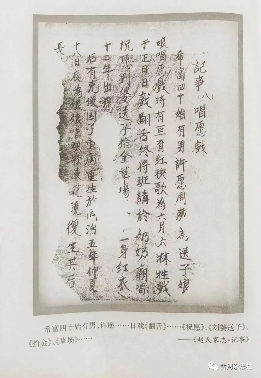又据朔州马邑《赵氏家志,记了篇第八:唱愿戏》载:雍正六年希富四十始有男,许愿周岁为送子娘娘唱愿戏,时,有秧歌戏为六月六日淋生戏,于正日日场巧女翻舌终,将戏班请于奶奶庙,唱“祝愿刘婆送子、拾金”,尔一身红衣十二年。后有克俊因子重病重生,于同治五年仲夏十八日,为奶奶庙唱秧歌“对凌花、复生”,其后子长寿。