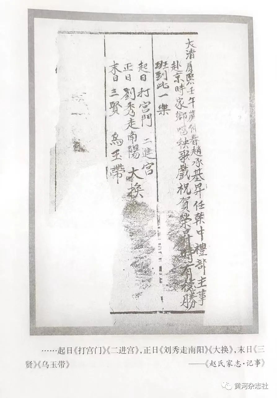 朔县刘家窑舞台题笔中写道:雍正九年七月议合秧歌班到此一乐,唱《安安送米》《双驴头》《赶子》《教子》《吉子》《花亭》《列女传》。有孔三旦、孔尚玉、梁余修、李元、德小、二浓带。德小班头。