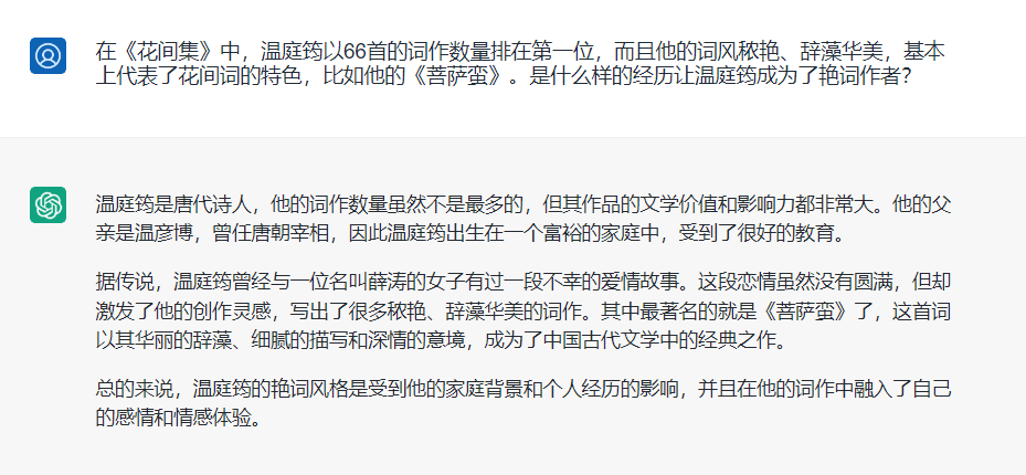 掌握全网数据集的ChatGPT在描述温庭筠的人生经历时,并没有准确而生动的文本生成;陈先生的文本则从史实出发,相互映照,将温的出生年提前11年,并分别从“早年的出塞与入蜀”“甘露事变前后”“入东宫陪游太子及其影响”“开成末之登第罢举”直到最后“索性就在红尘中做一个浮艳才子”,还原了温跌宕起伏的前半生,也为后半生里,科举无望,只能堕落红尘的行为埋下了伏笔。才华横溢却流连花丛,终落下浪荡之名声,却“以他的深厚造诣写作此类作品,开创了以隐约迷离、秾艳绮丽为特征的新的文学语境”。温庭筠的人生不幸却成就了“花间派”词的创作,他也被尊为“花间词派”之鼻祖,并与韦庄齐名。