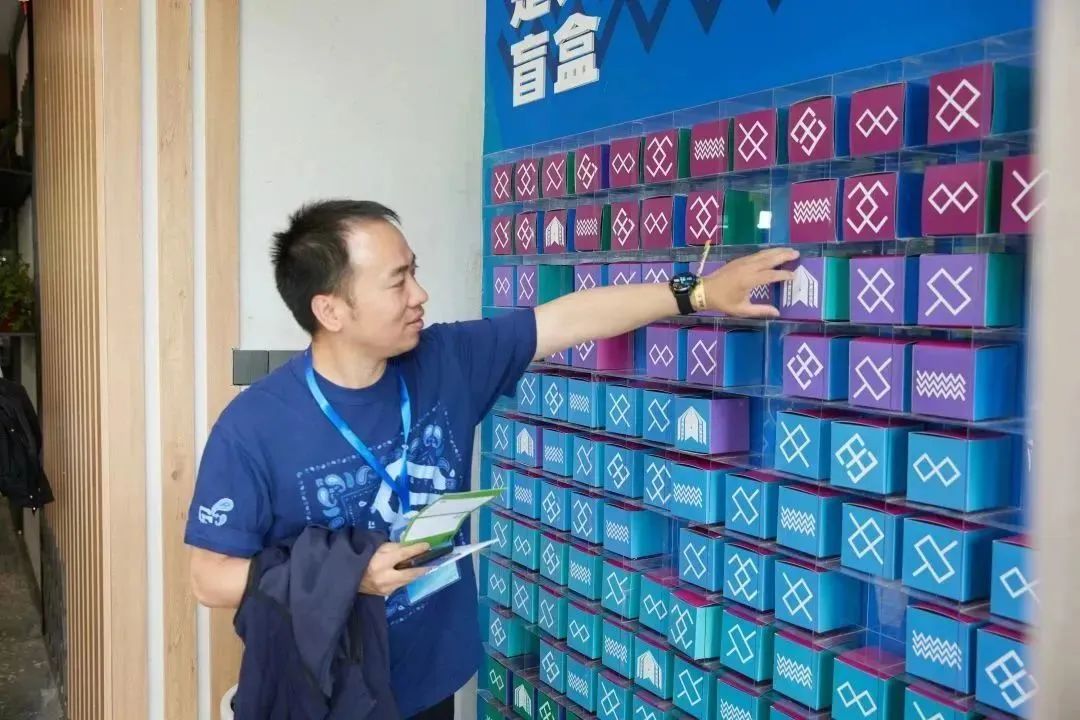 作家驿站的入口,有一整面墙都是文学盲盒,不同色系的盲盒上印有畲族传统彩带中的织纹图案,有的代表“天长地久”“沟通”,有的代表“田野”“鱼”“民族繁荣”等。参与者完成探营日任务可从中抽取礼物,有网络文学名家签名实体书以及畲乡网络文学村自己设计的帆布袋、胸针、书签、手机支架等文创周边产品。作家活动照片墙和几个放满网络文学实体书的书架旁,有山花随意点缀,颇具人文意趣,这一静态空间让人感受到一种被邀请了解、感受、交流的互动感。