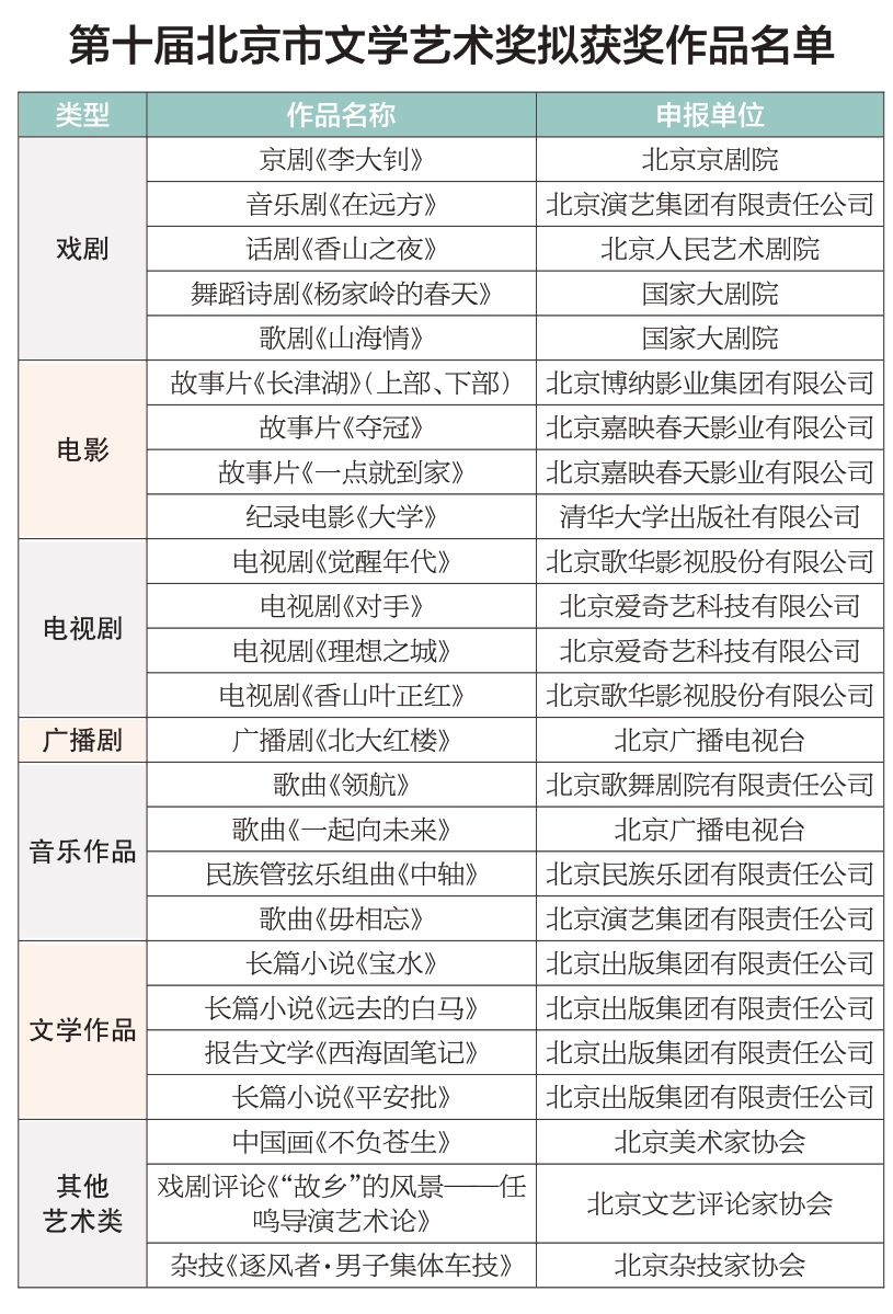 为充分听取社会各方面意见,确保第十届北京市文学艺术奖评选公平、公正,现将本届拟获奖作品名单予以公示,公示期为2023年5月17日至2023年5月23日。在此期间,凡对公示作品有异议的,请向第十届北京市文学艺术奖评委会办公室提交书面意见,并签署真实姓名或加盖公章。联系邮箱:whc@bjxcb.gov.cn